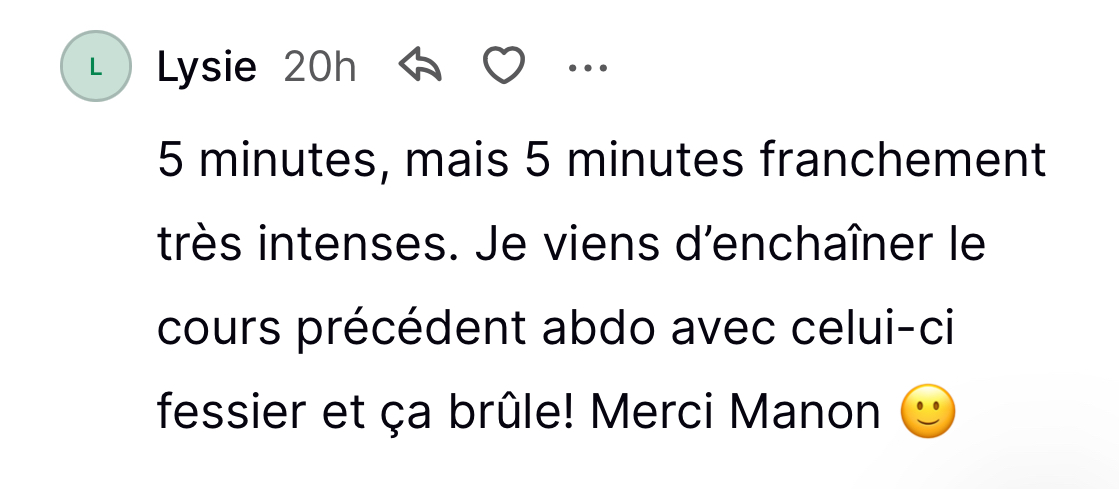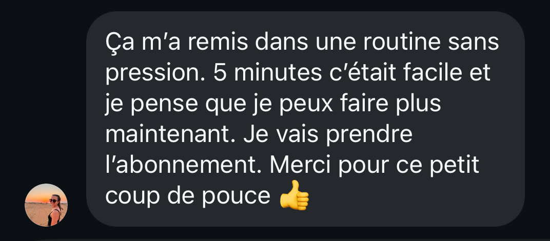 Avec seulement 5 minutes par jour, tu réveilles ton corps, tu engages tes muscles profonds et tu poses les bases d’un vrai bien-être. Progressivement, tu verras que ton corps réclamera naturellement plus de temps, parce qu’il aura pris goût à ce moment dédié rien qu’à toi.