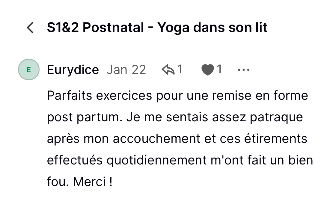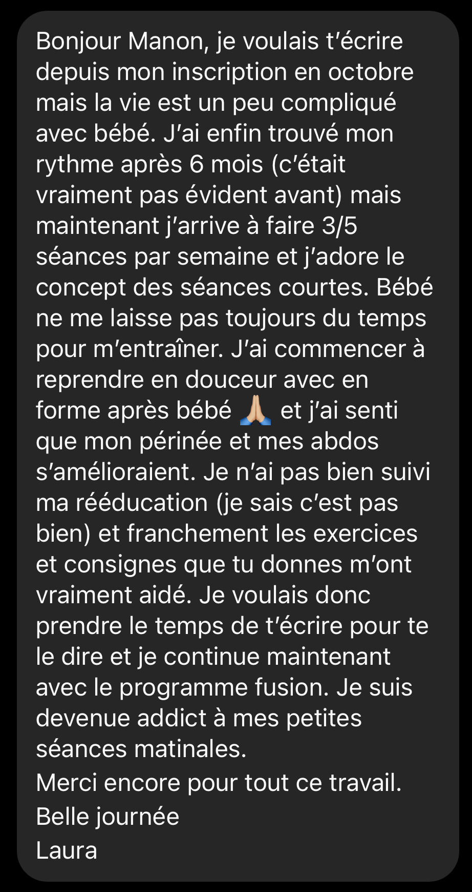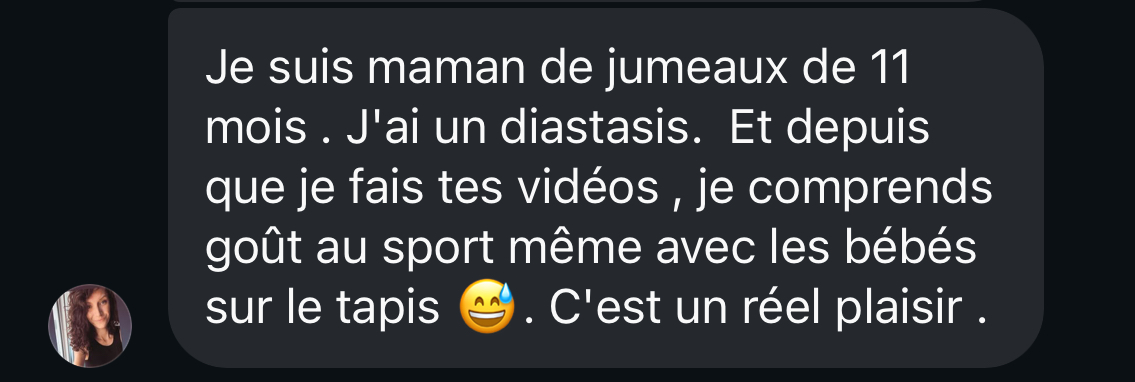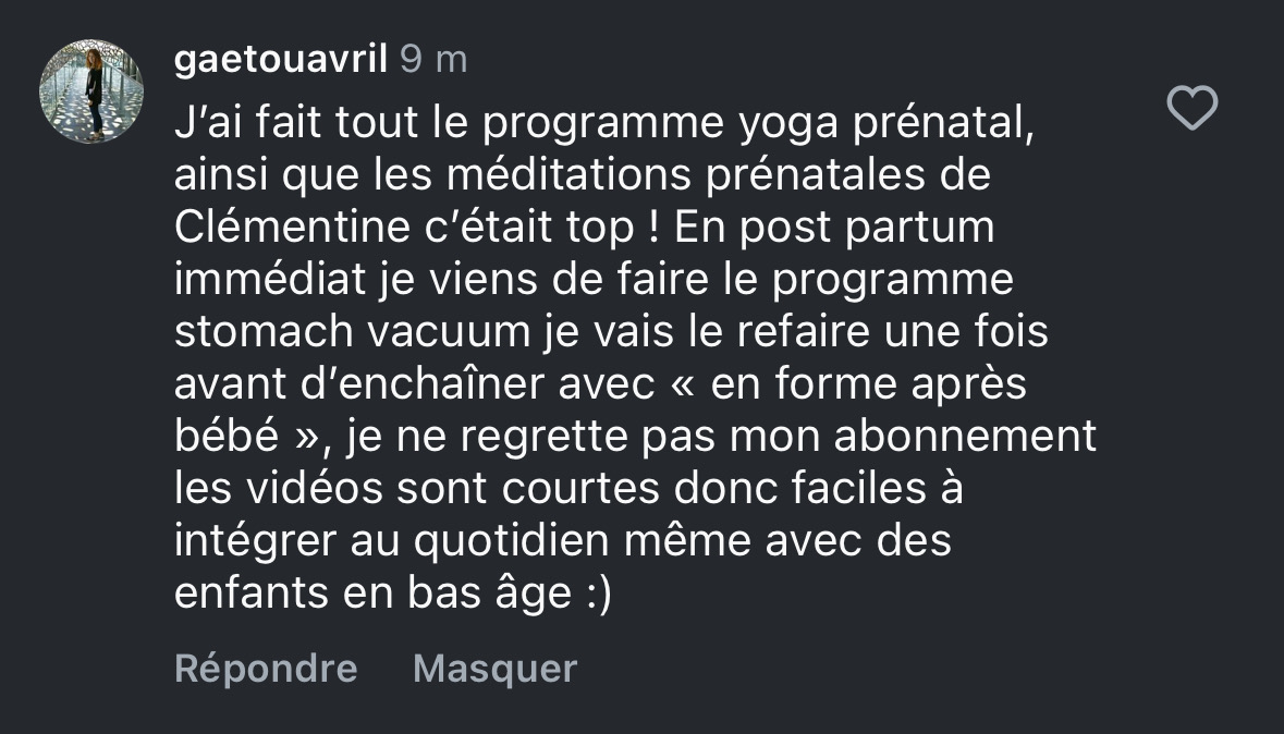 "J'ai commencé le programme « En forme après bébé » un mois après avoir accouché parce que j'avais envie de me remettre sur mon tapis yoga, j'ai eu un accouchement naturel sans complications, juste quelques points à la fin).