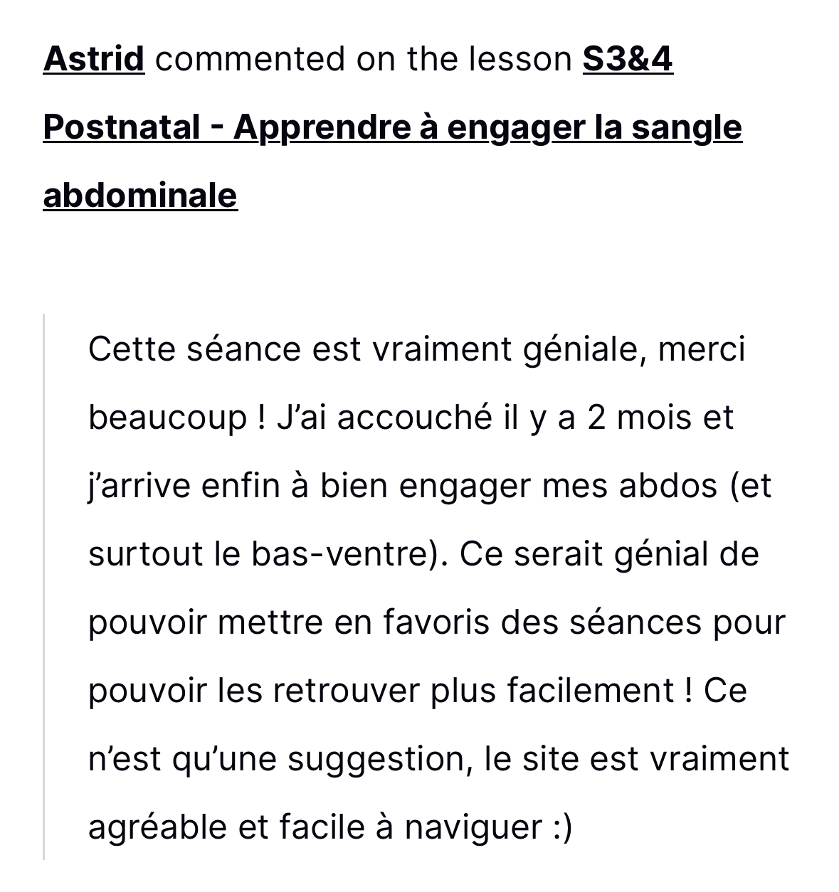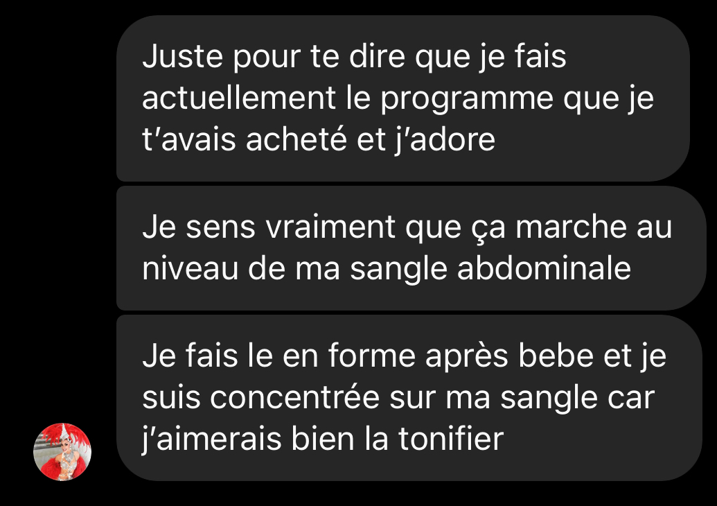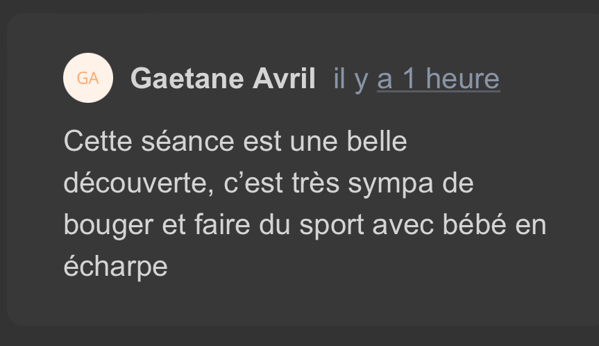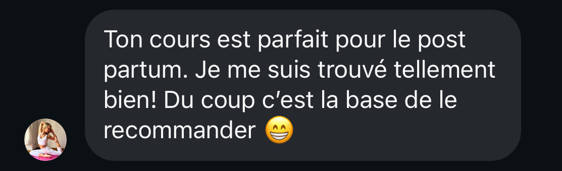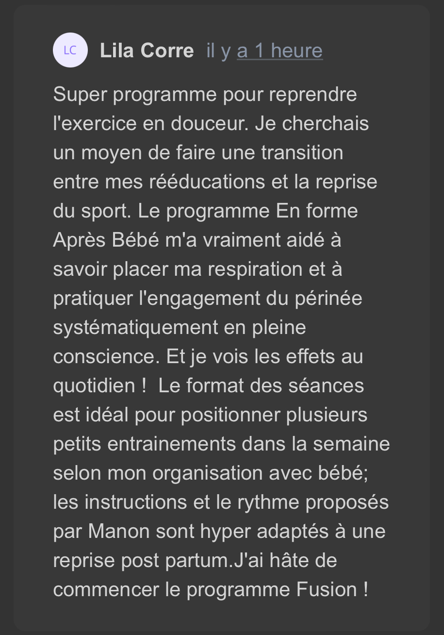 "J'ai commencé le programme « En forme après bébé » un mois après avoir accouché parce que j'avais envie de me remettre sur mon tapis yoga, j'ai eu un accouchement naturel sans complications, juste quelques points à la fin).