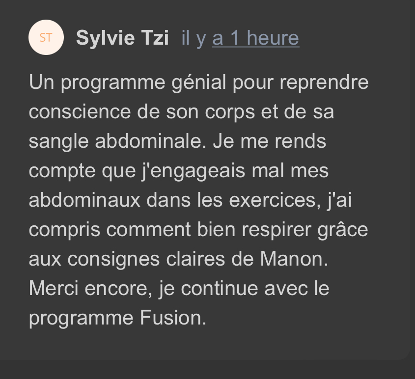 Manon est une prof incroyable qui explique super bien chaque mouvement. Les cours ont une durée qui bien s'adapte à la vie de jeune maman (pas trop de temps libre) et 20 minutes sont suffisantes pour prendre soin de soi-même et libérer un peu la tête.