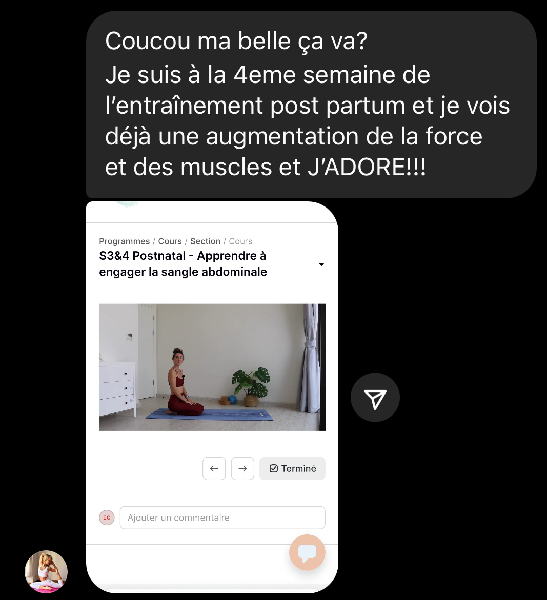 « J’ai commencé le programme dès mon retour à la maison. Les premières séances m’ont permis de me reconnecter à mon souffle, à mon ventre, à mon périnée.