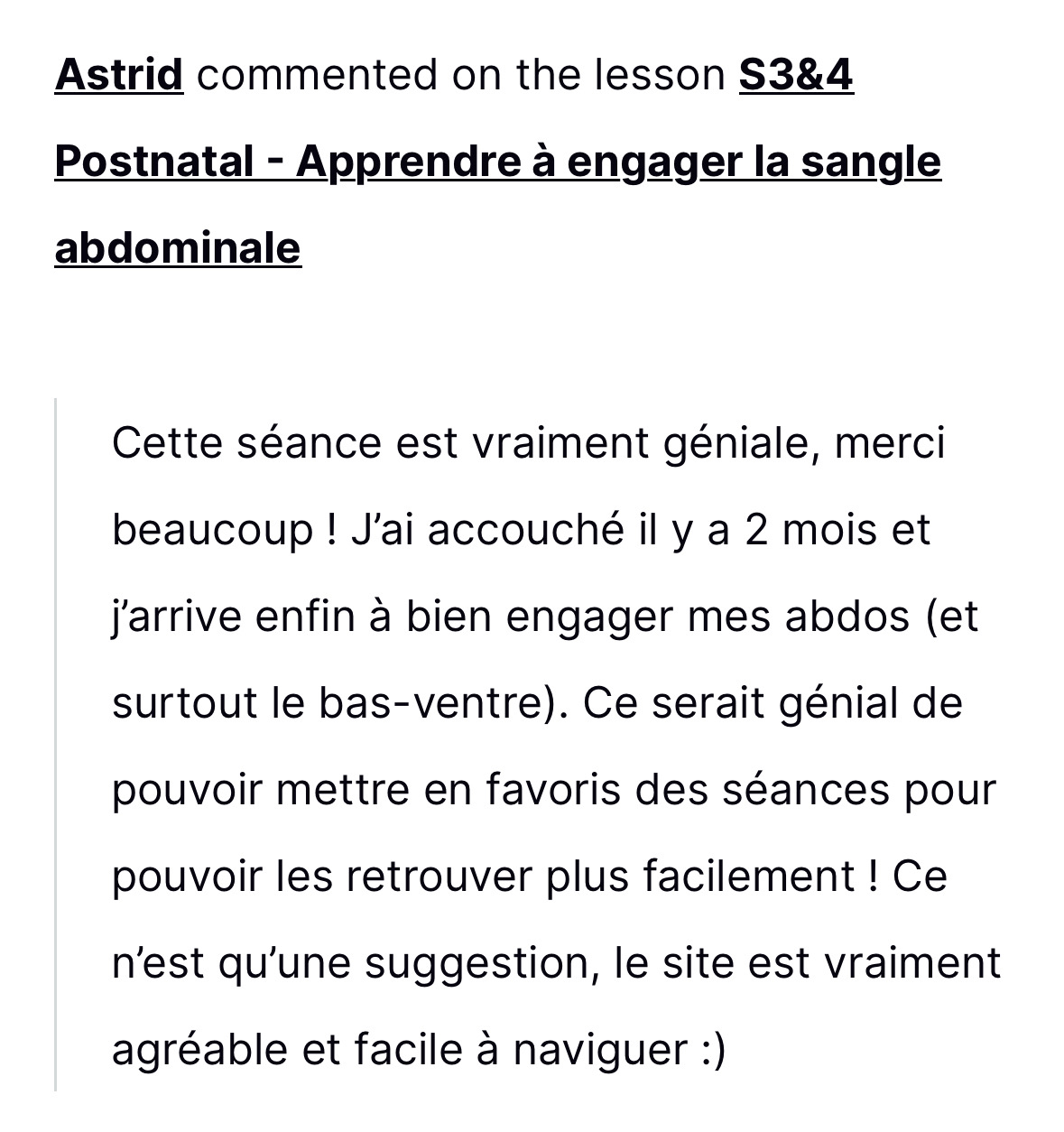 Elisa a très rapidement constaté des résultats visibles et profondément ressentis : un ventre plus tonique, une posture rééquilibrée, moins de douleurs lombaires et une énergie retrouvée — le tout sans jamais forcer.