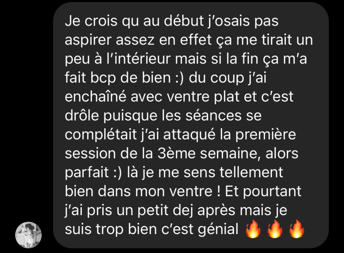 En parallèle, tu peux intégrer le Stomach Vacuum dans ta routine quotidienne (le matin à jeun ou éloigné des repas) : c’est rapide, efficace et parfait pour activer ton centre et réduire les ballonnements.