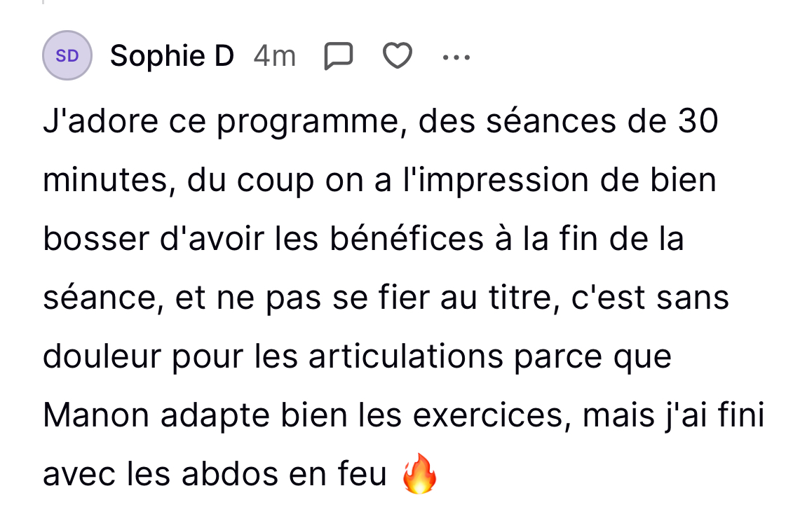 Le programme idéal si tu souffres de douleurs articulaires, de problèmes aux genoux, poignets ou cervicales. Grâce à des options adaptées, tu peux continuer à bouger en toute sécurité et à ton propre rythme.